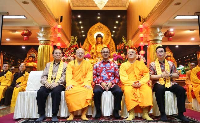 Bhante Aryamaitri, Kepala Wihara Ekayana Arama yang mendampingi Anies memberi salam kepada umat dan berfoto. Anies juga mendapat selendang merah marun dari pengurus vihara. “Ini selendang berkah,” ujar Bhante Aryamaitri.