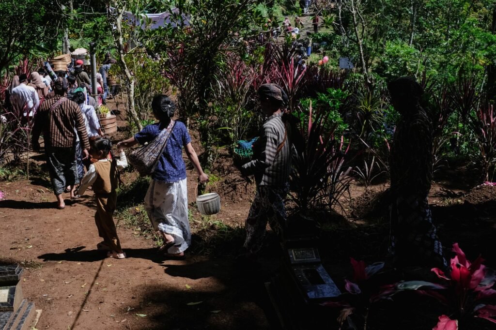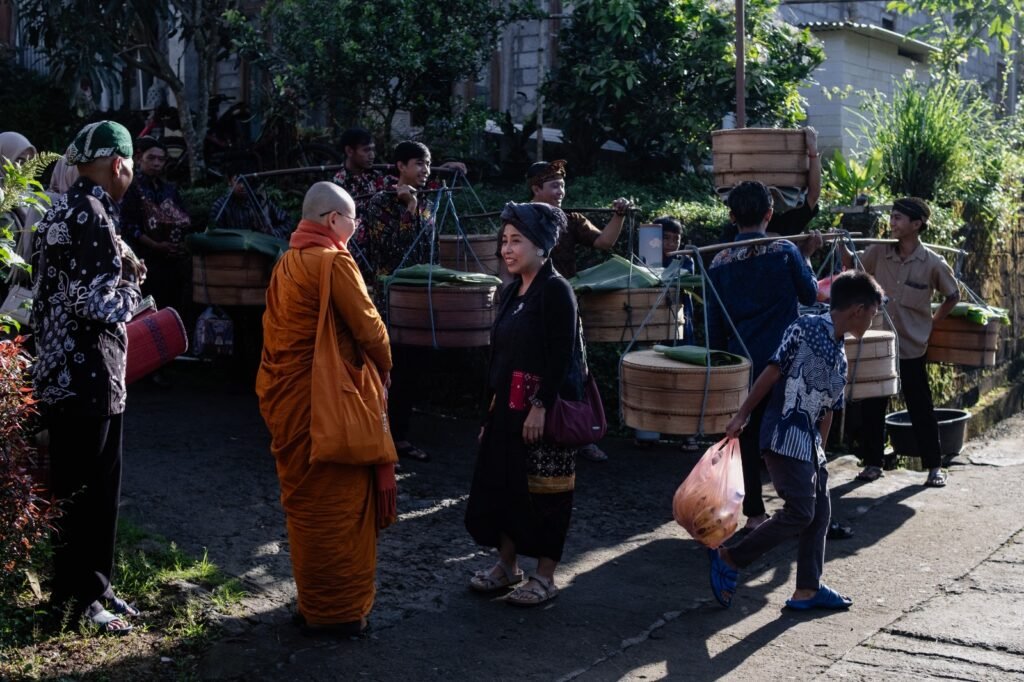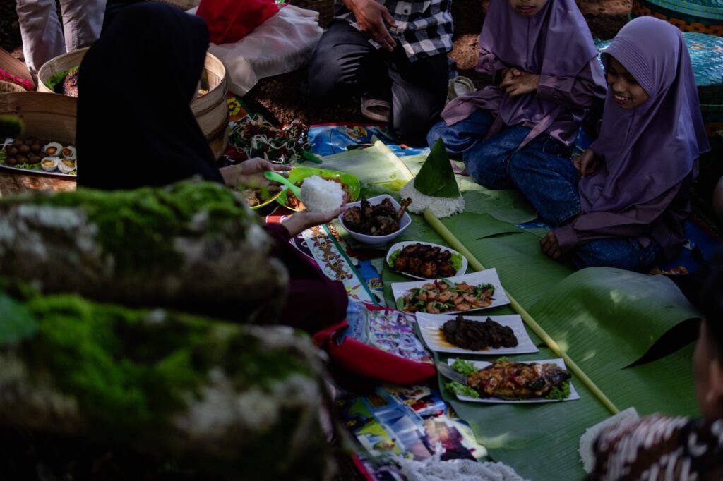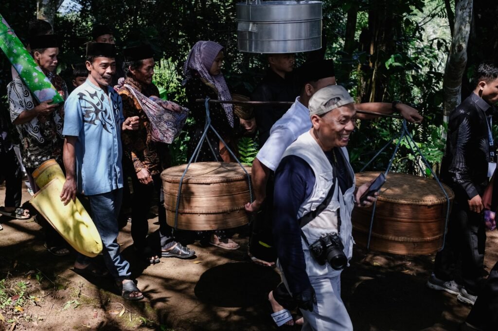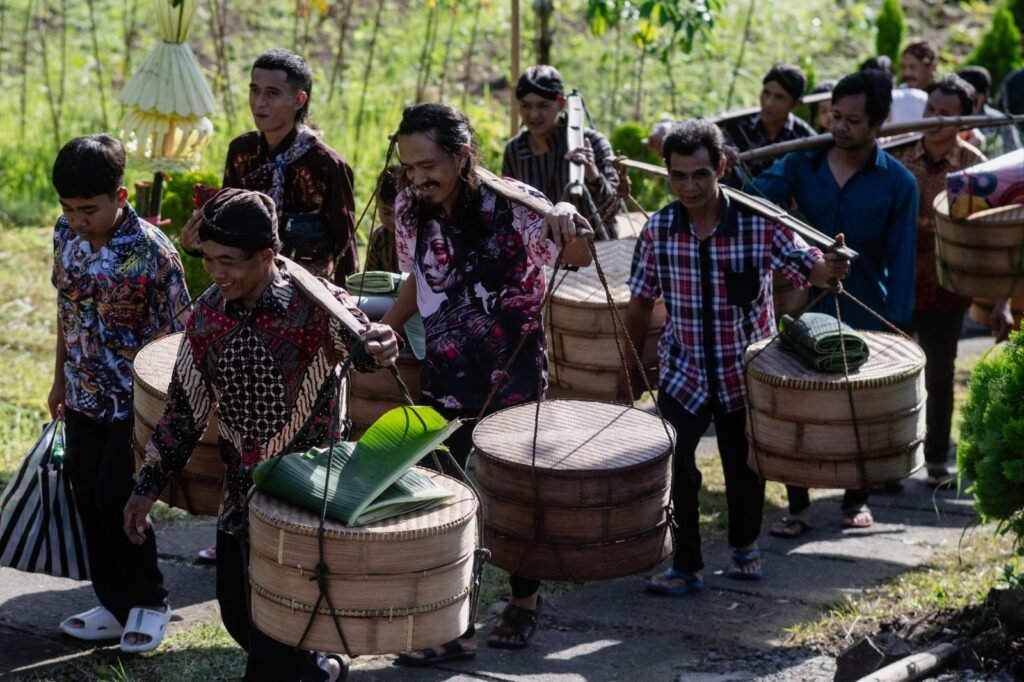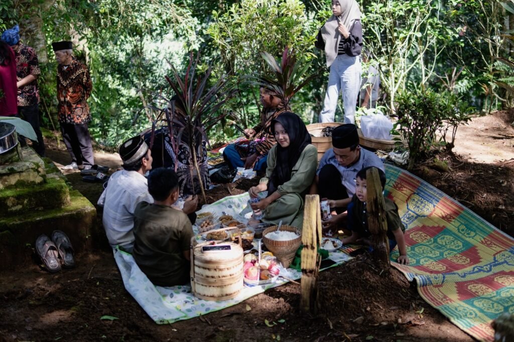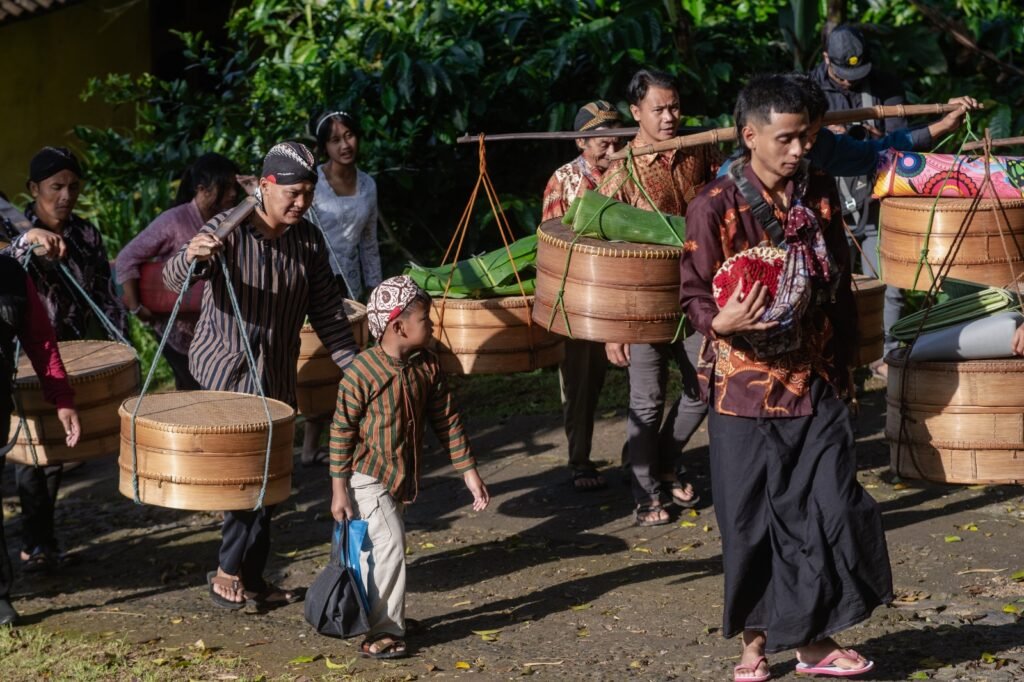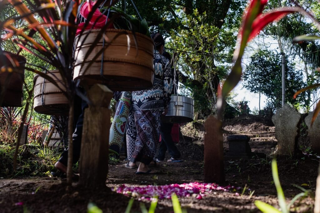 Tak lama berselang, pintu-pintu rumah mulai terbuka. Para lelaki keluar sambil membawa tenong, wadah makanan dari bambu. Para perempuan mengemban tumpeng, sementara anak-anak mengangkat tikar. Dengan langkah perlahan, mereka menyatu dalam barisan yang bergerak menuju makam.