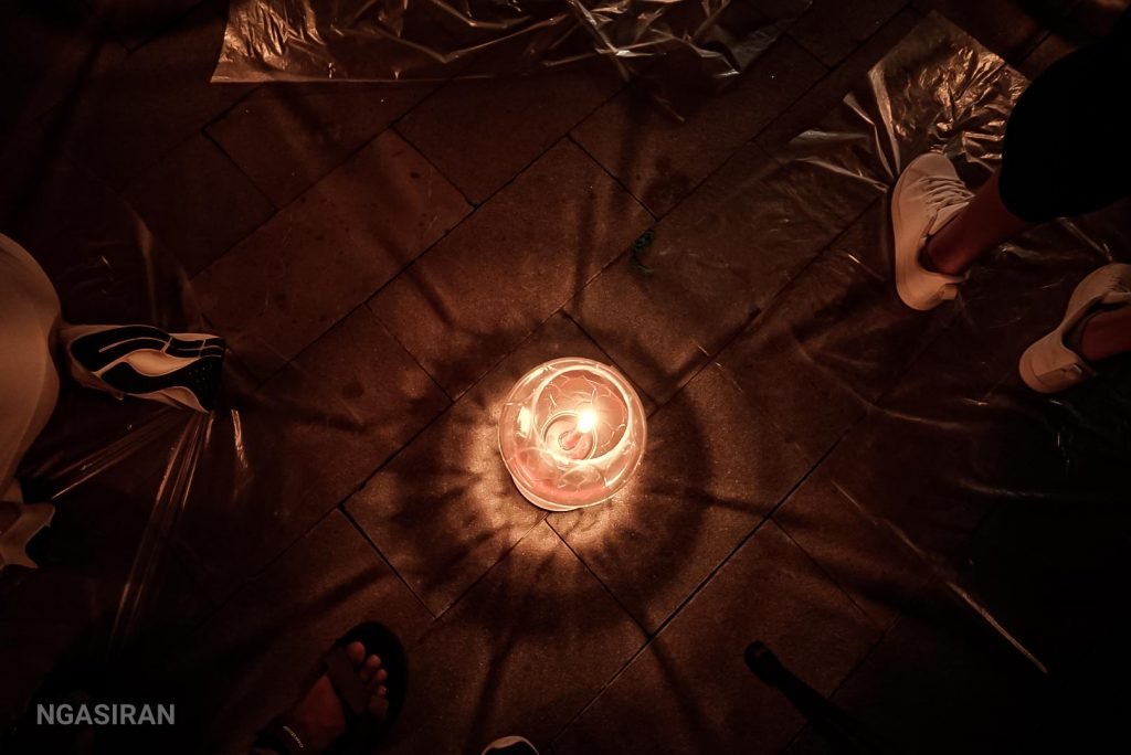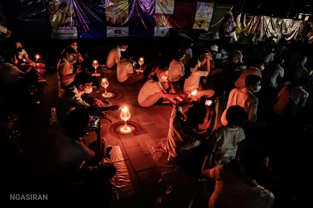Sebelum lilin dinyalakan dengan sumber api abadi, Merapen, bhante mengajak peserta untuk menyalakan api perdamain disetiap diri yang hadir. “Mari kita sama-sama melakukan perdamaian itu dengan meditasi,” ajak bhante. Selesai meditasi, peserta mulai menyalakan lilin-lilin yang ada dihadapan masing-masing.