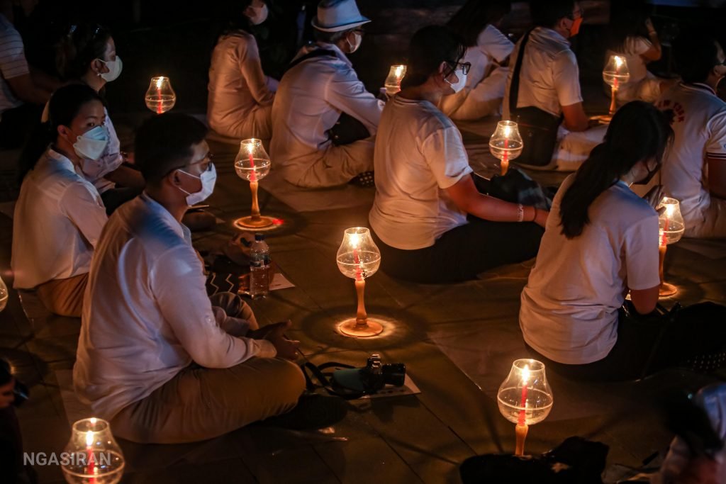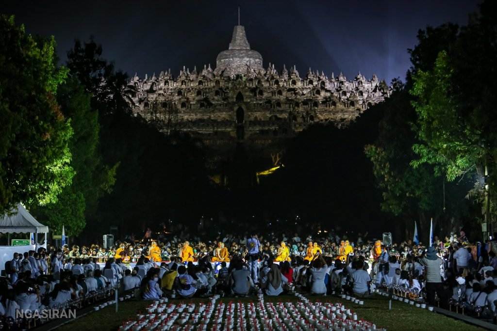 Pukul 7 malam, saat purnama masih condong di sebelah timur tenggara, umat Buddha yang mengenakan baju putih duduk rapi menghadap Candi Borobudur. Di sekeliling mereka terdapat lilin dalam gelas yang tertata rapi. Bagian depan terdapat panggung memanjang. Di panggung itu puluhan bhikkhu duduk memberi arahan kepada peserta.