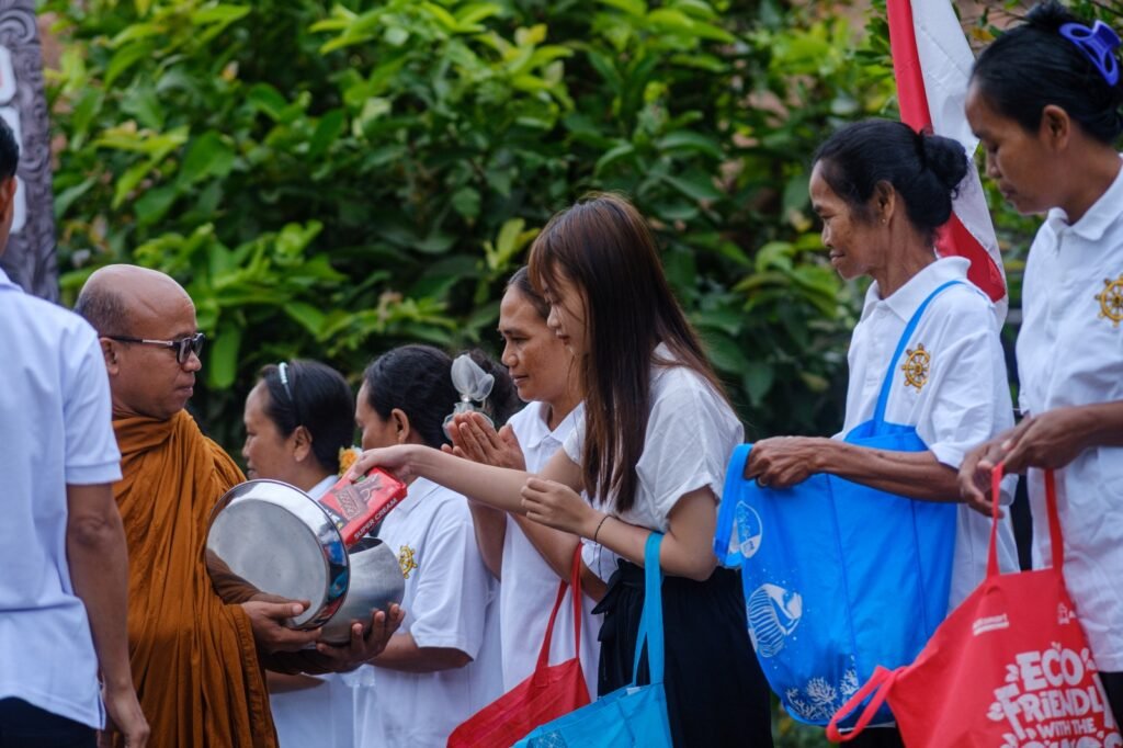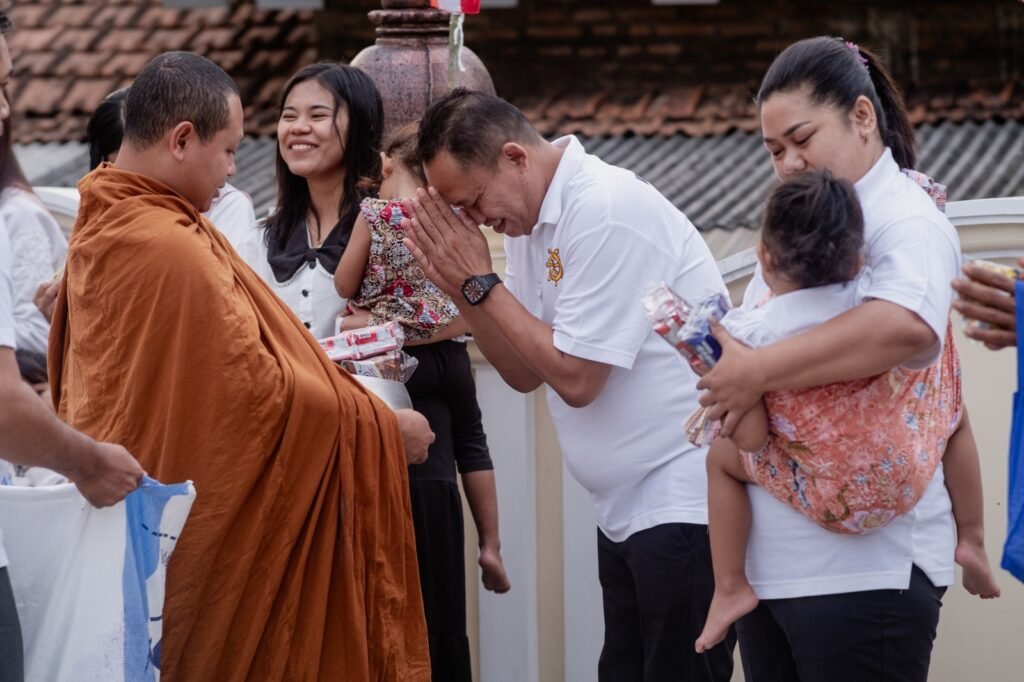 Dengan hati penuh sukacita dan antusiasme, satu per satu umat menempatkan persembahan makanan ke dalam mangkuk (bowl) yang dibawa oleh para bhikkhu. Senyum tulus mengembang, mencerminkan kebahagiaan dan ketulusan dalam berbagi.