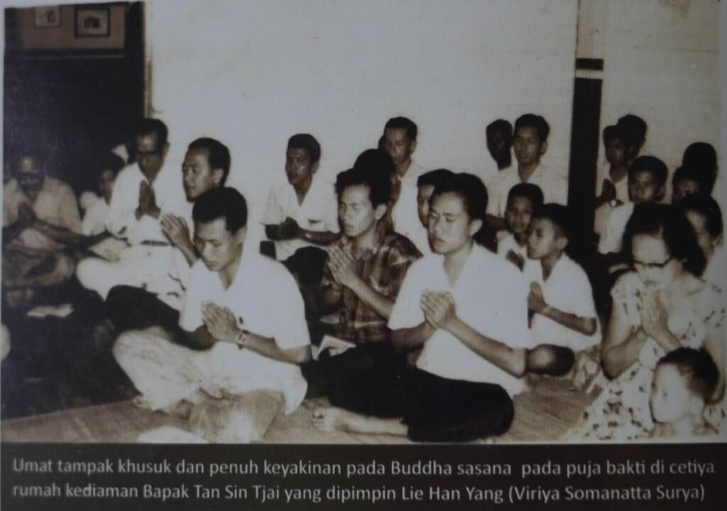 Lantaran Samarinda belum memiliki cetiya maupun vihara pada saat itu, puja bakti pun terpaksa mereka lakukan di kelenteng. Namun tetap dijalankan dengan semangat, dan mampu mengundang lebih banyak orang untuk bergabung. Beberapa tokoh di antaranya yang cukup aktif adalah Goey Eng Tjiang, Thio Djin Tie, Ho Tjin Sin, Lie Gwan Hoey, Lim Pun Ho, Tan Sin Tjai, dan para umat lainnya.